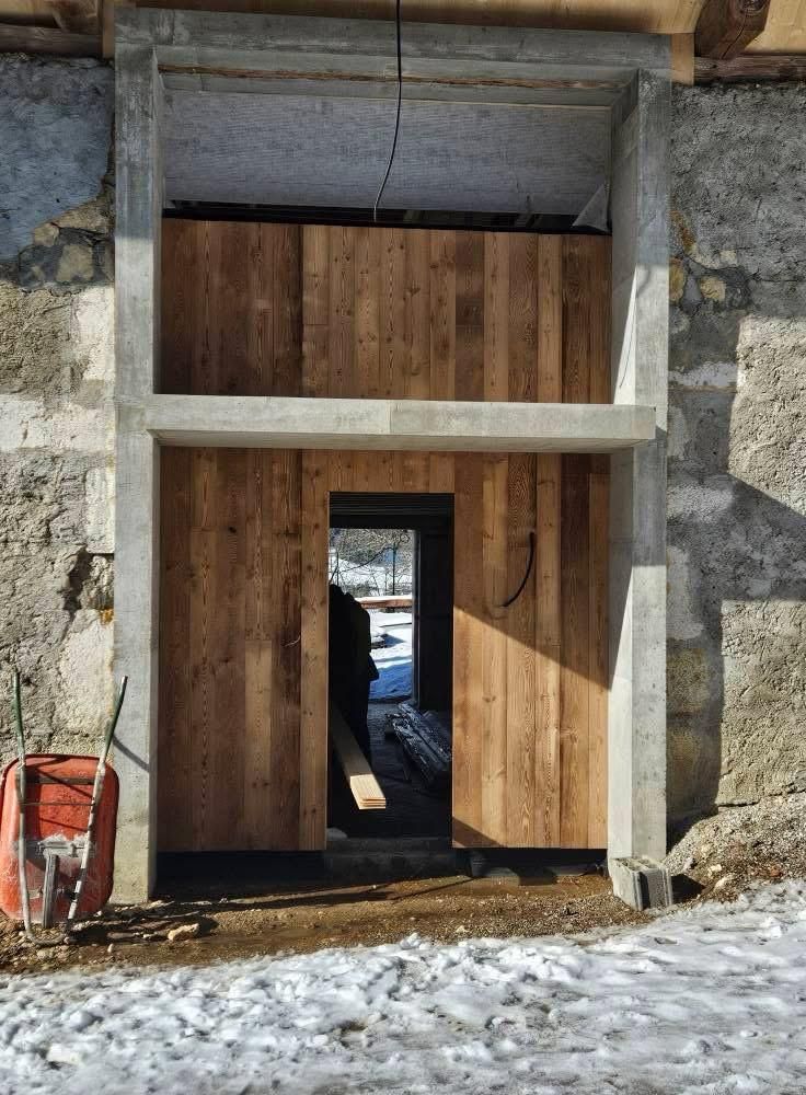 - Reconstruction partielle de la façade et du pignon, habillés de bois local, pour une parfaite intégration paysagère et une valorisation du bâti traditionnel.